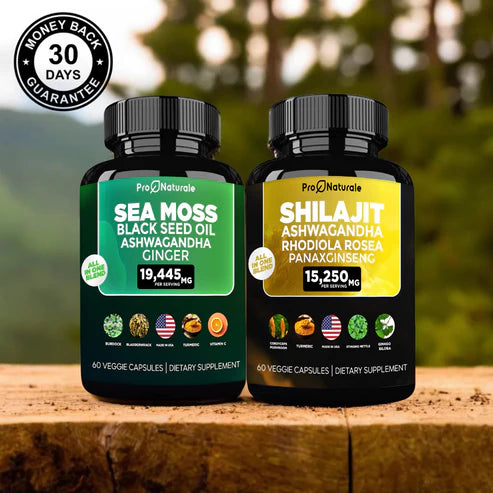 El musgo marino ofrece potentes propiedades energéticas y desintoxicantes, mientras que el shilajit es famoso por su composición rica en nutrientes, conocida por proporcionar un inmenso poder cognitivo y beneficios antienvejecimiento.